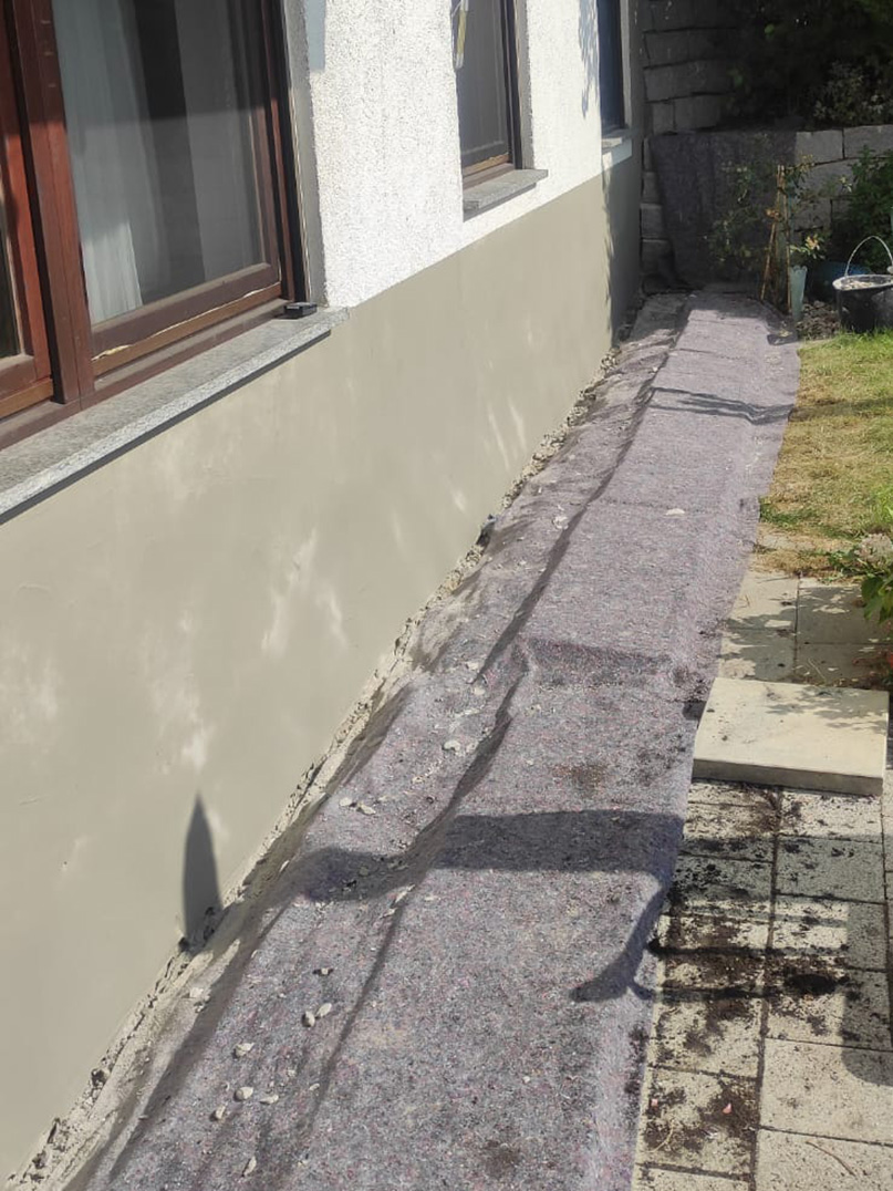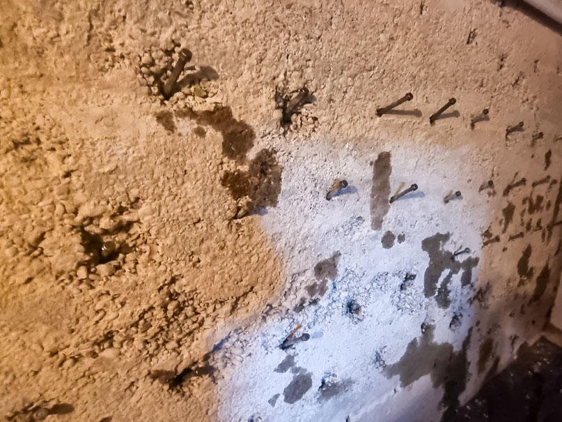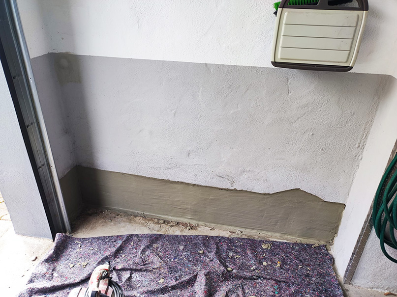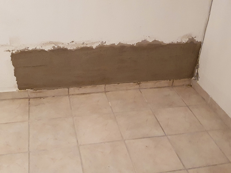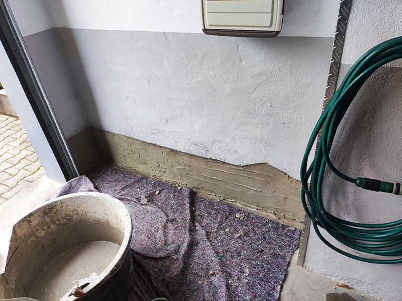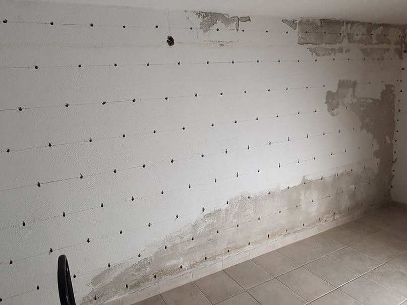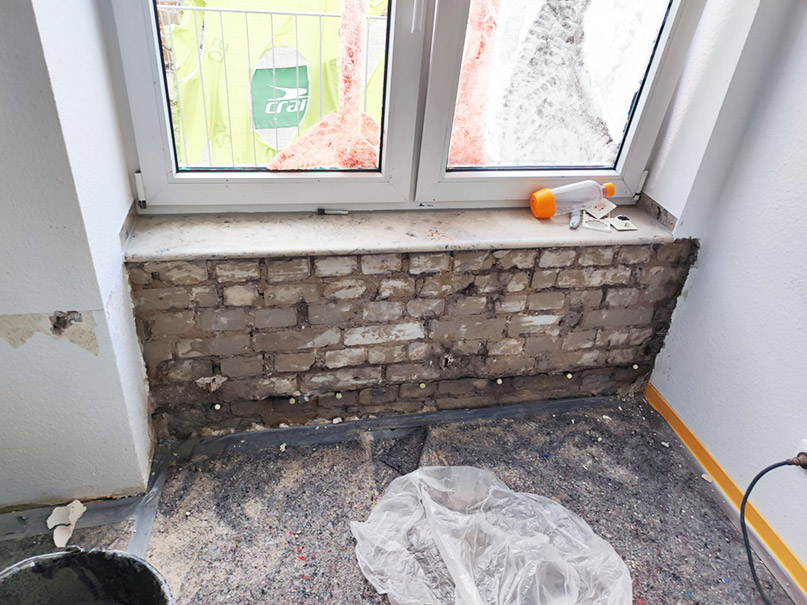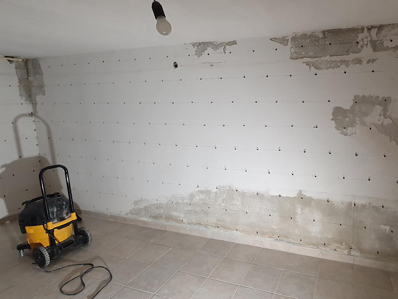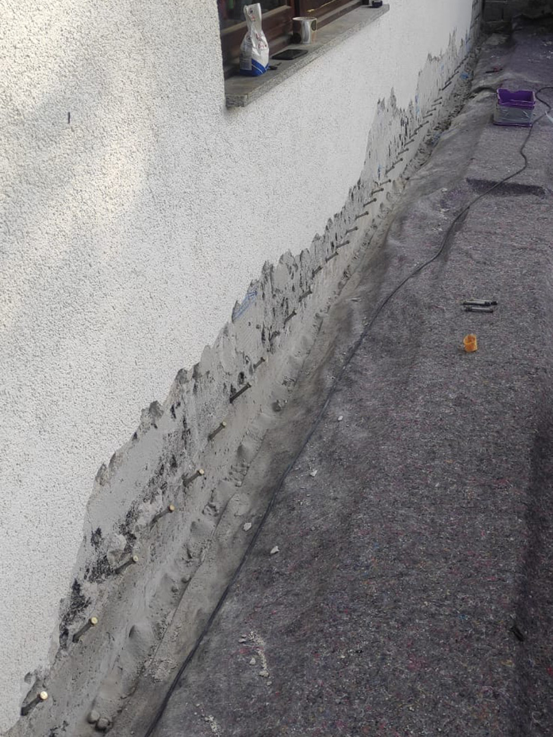 Abklopfen des alten Putzes mit einem Hammer. Setzen von Bohrungen für eine nachträgliche Horizontalsperre. Mittels Injektion wird unser Spezialparaffin in die Wand eingebracht. Aufbringung eines Sperrputzes. Zu guter Letzt ein paar Malerarbeiten. Fertig ist die neue, trockene Wand.