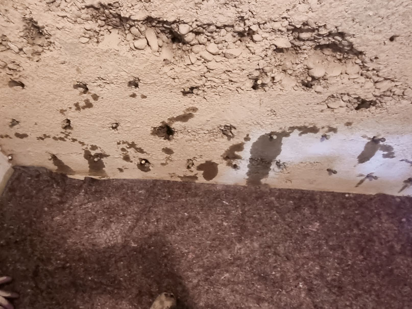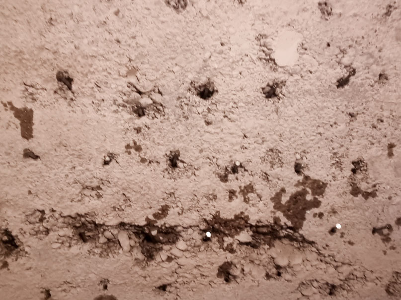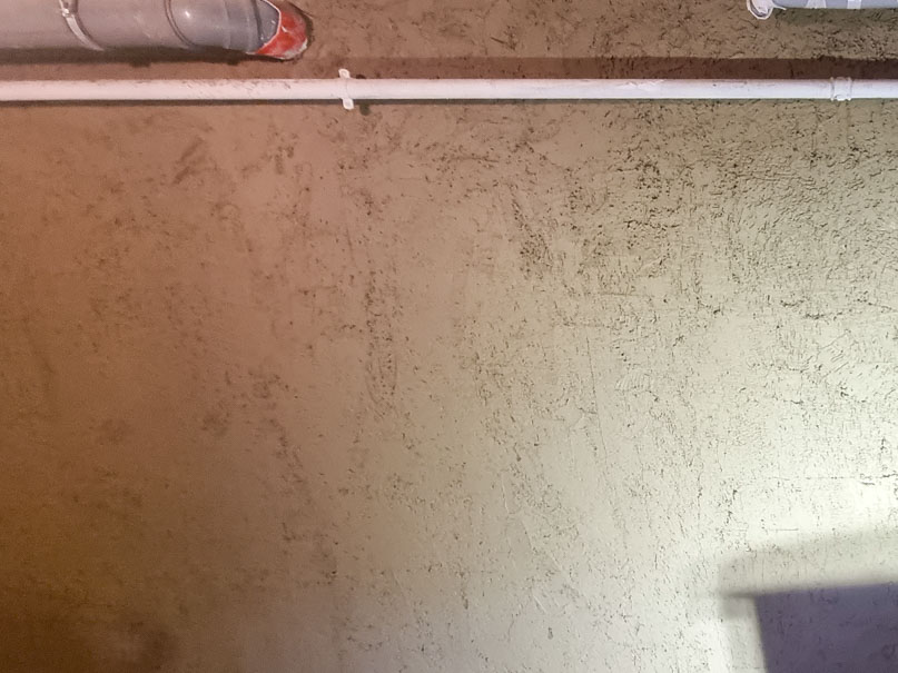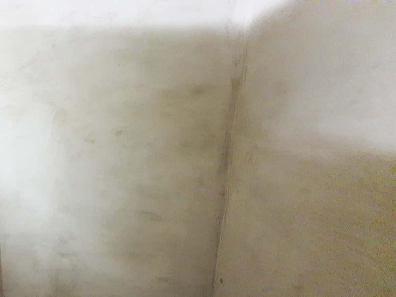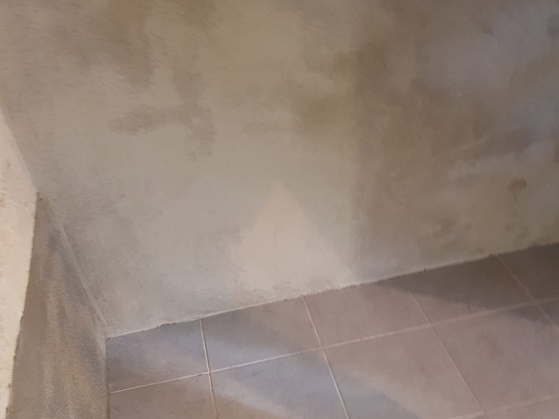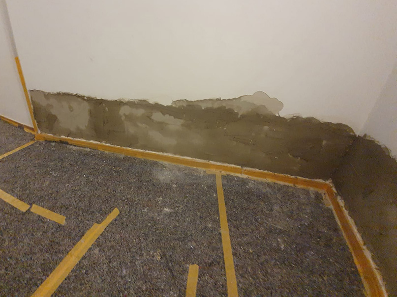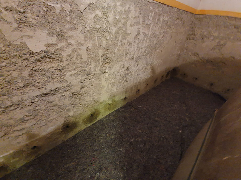 Nachdem alle vom Schimmel befallenen Rigipsplatten entfernt wurden, konnten wir den Schaden in Augenschein nehmen. Durch eine defekte Bodenfuge drückte das Regenwasser in den Keller. Unser nachträglicher Boden-Wandanschluss mit Hohlkehle hat dieses Problem gelöst. Eine Außenwand war sogar komplett durchnässt, und wurde vollflächig hydrophobiert (Flächensperre).