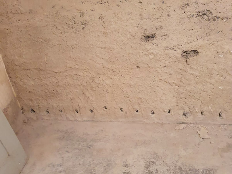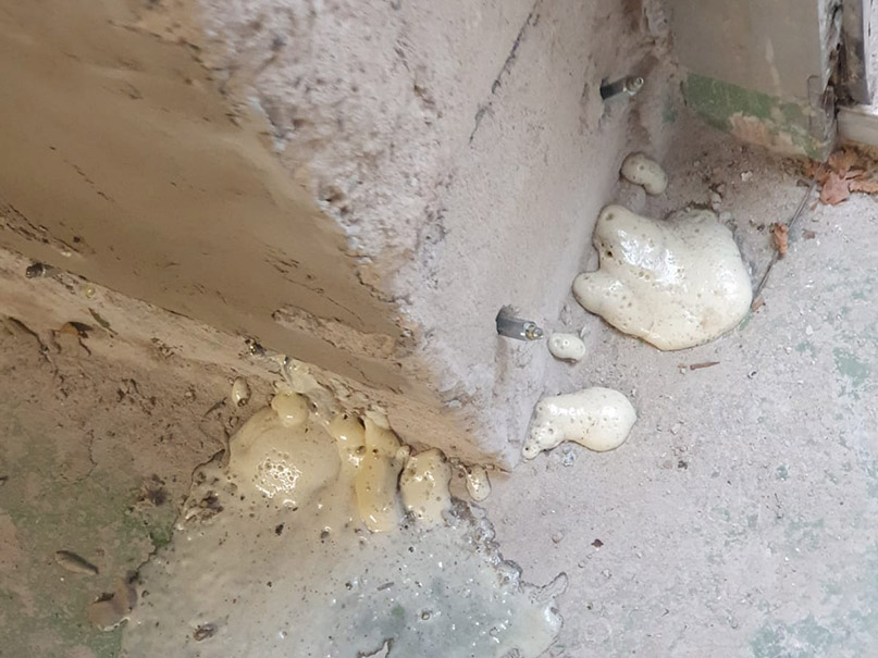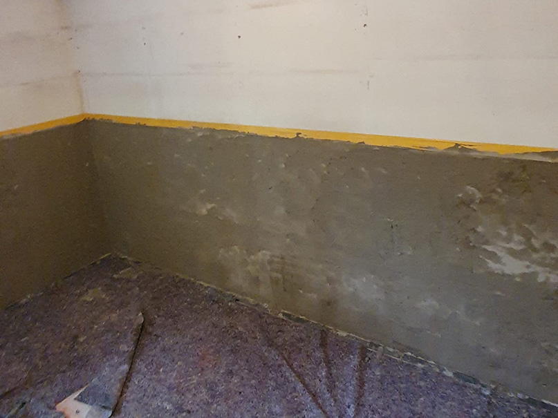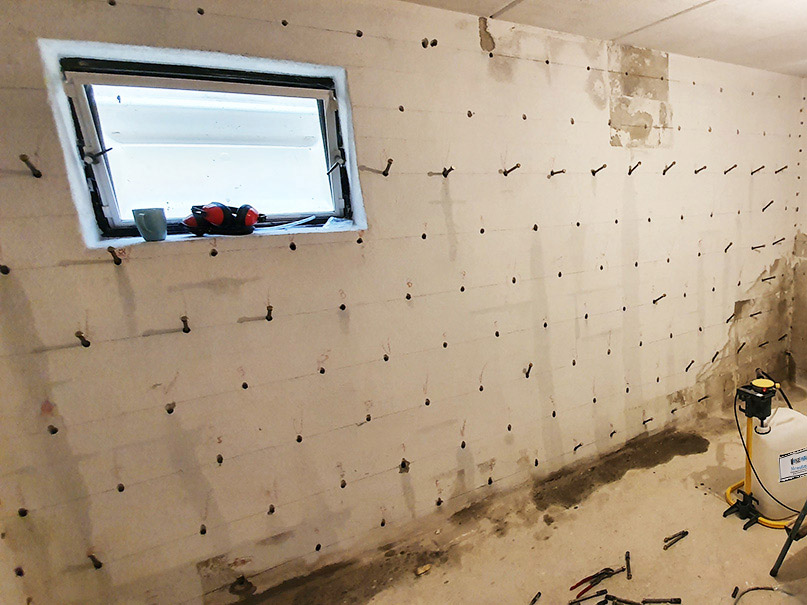 Eine Möglichkeit zur Abdichtung des Wand-Boden-Anschlusses bei Betonwänden besteht darin, eine Hohlkehle oder Dichtkehle aus druckwasserfestem Mörtel zu verwenden. Nach dem Auftragen einer Schicht Dichtschlämme über die Kehle werden Bohrungen oberhalb davon angebracht. Diese Bohrlöcher werden mit Packern versehen und unser Injektionsmittel wird unter hohem Druck injiziert. Durch den entstehenden elastischen Schaum werden alle Hohlräume gefüllt, was dazu beiträgt, den aktuellen Wassereintritt zu stoppen. Diese Methode ist besonders bei nicht homogenem Mauerwerk vorteilhaft.