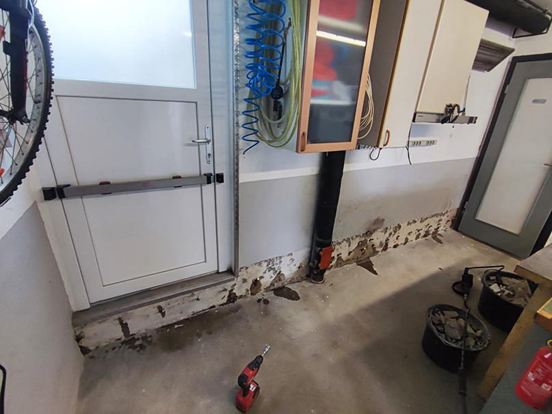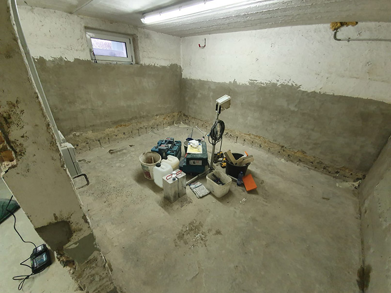 Der Keller eines Einfamilienhauses wies erhebliche Mängel auf. Salzausblühungen, Putzabplatzungen und nasser Boden. Um eine solche Durchfeuchtung zu vermeiden, mussten die betroffenen Bauteile dauerhaft davor geschützt werden.