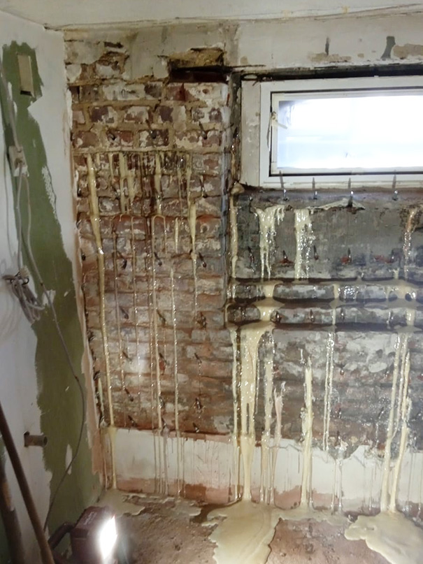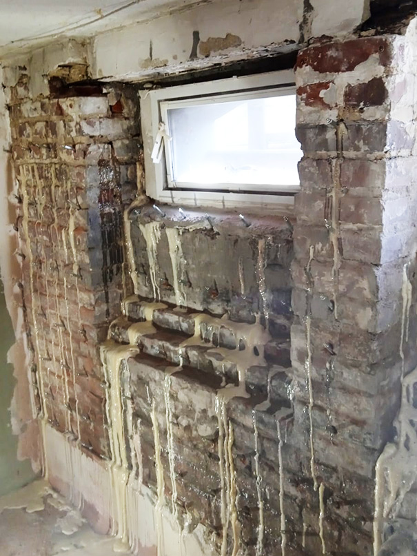Kewabo benutzt ein zweikomponentiges, phthalatfreies Kunstharz, dass zur Verfestigung von Mauerwerk und Beton verpresst werden kann. Hohlräume sowie Risse werden verfüllt und es kommt dank der Durchdringung des porösen Fugenmörtels mit dem Kunstharz zu einer Verklebung der Mauersteine. Die Mauer bleibt atmungsaktiv und die Wiederherstellung der natürlichen Wärmedämmung reduziert die Heizkosten spürbar.