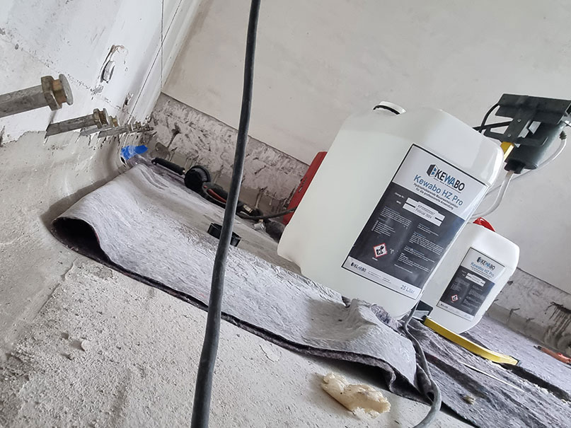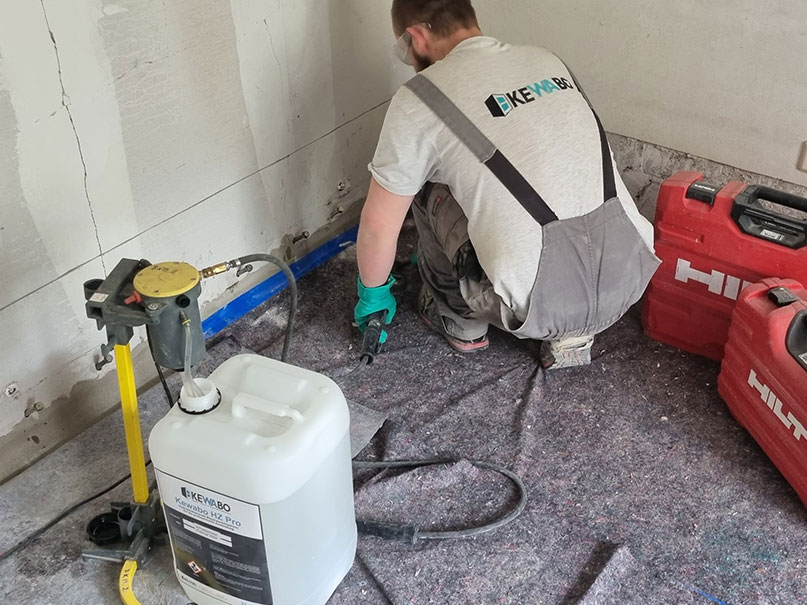 Mittels Niederdruckinjektion wird das Material KEWABO HZ in das Wand eingebracht. Dazu werden Bohrungen in einem Winkel von etwa 45° gesetzt. Die Bohrungen werden, abhängig von der Beschaffenheit des Mauerwerks und des ausgewählten Produktes, in Abständen von 12,5 bis 25cm in die Wand gebracht.